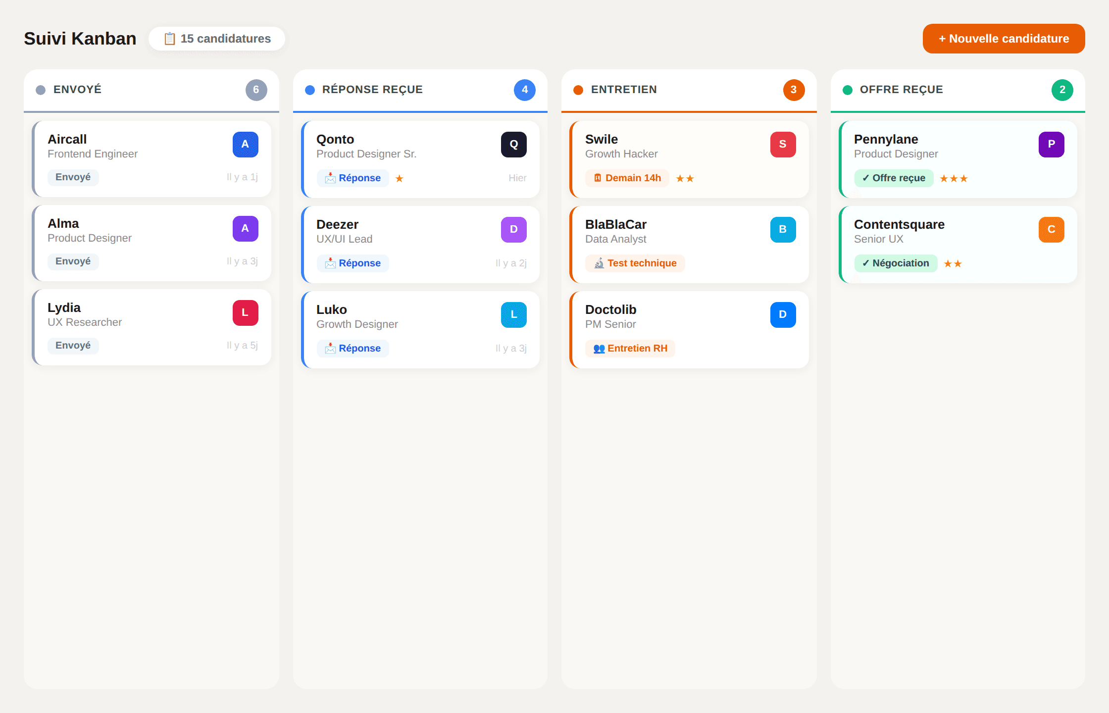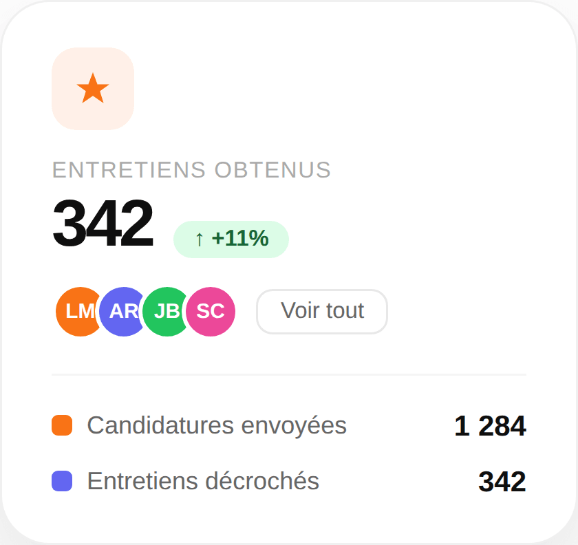 Le kanban de suivi est top. Je sais exactement ou en est chaque candidature sans devoir tout gerer dans Excel.