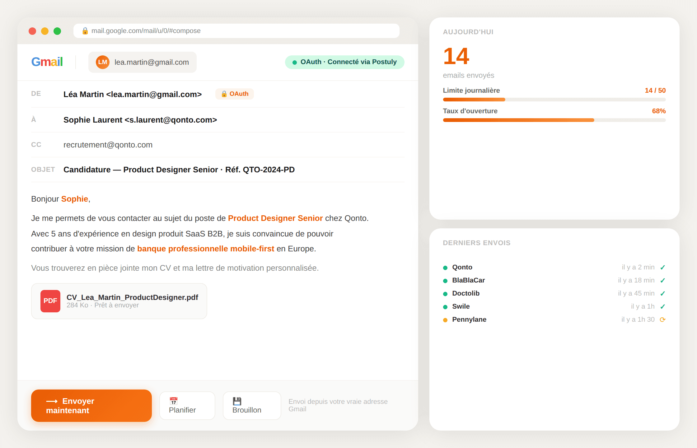 En quelques minutes, Postuly trouve les entreprises, rédige vos lettres et envoie vos candidatures depuis votre Gmail.